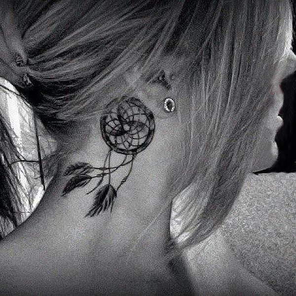 女生脖子上黑灰素描点刺技巧创意唯美捕梦网纹身图片