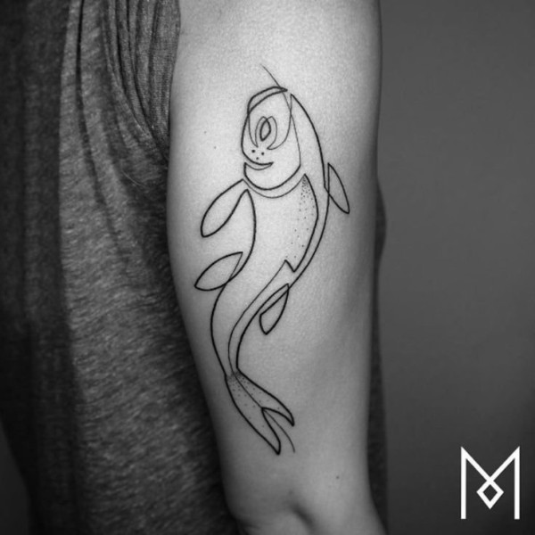 男生手臂上黑色线条创意文艺鱼纹身图片