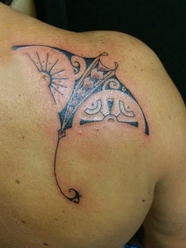 男生后肩上黑色几何简单线条小动物鲼纹身图片