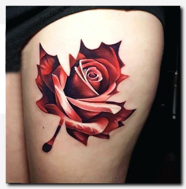 女生大腿上彩绘水彩素描创意文艺枫叶玫瑰纹身图片