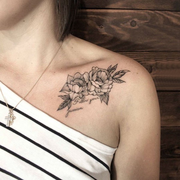 女生锁骨下黑灰素描点刺技巧创意唯美花朵纹身图片