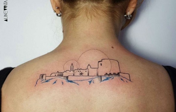 女生背部黑色线条素描创意文艺唯美城堡纹身图片