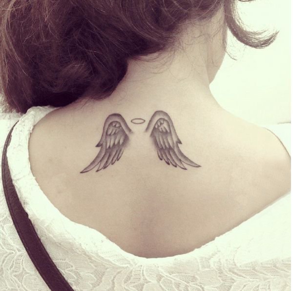 女生背部黑灰素描点刺技巧创意翅膀纹身图片