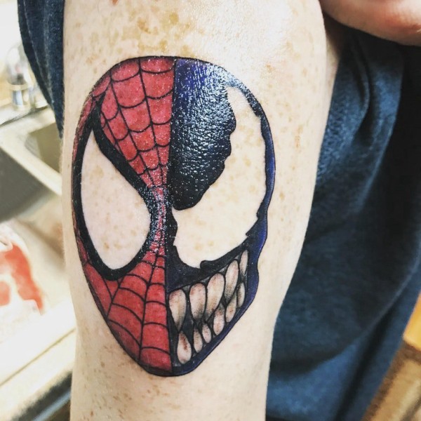 男生手臂上彩绘几何简单线条骷髅和蜘蛛侠拼接纹身图片