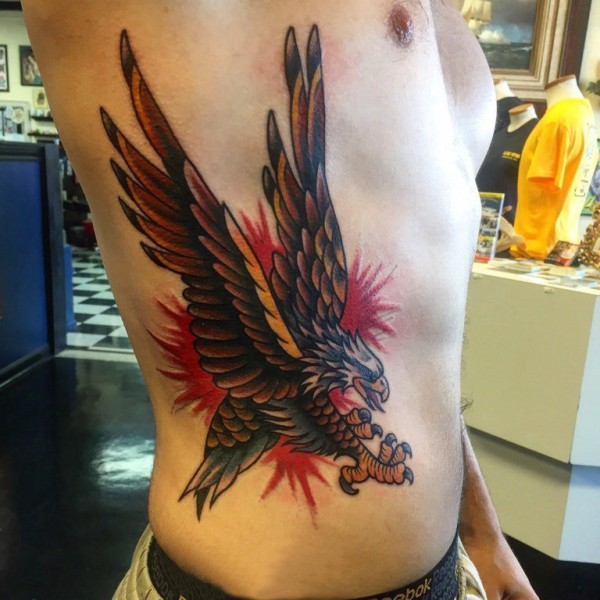 男生侧腰上彩绘简单线条小动物老鹰纹身图片