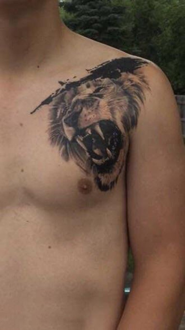 男生肩部黑灰点刺简单线条小动物老虎纹身图片