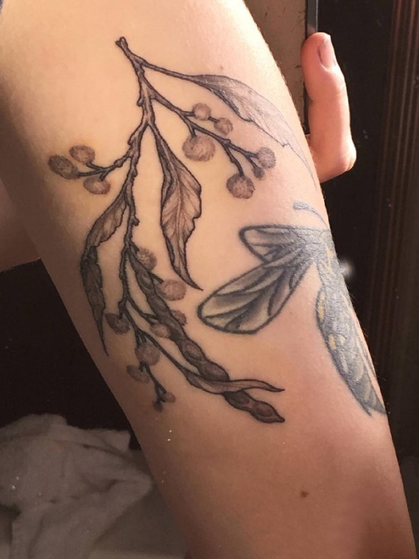 女生小腿上黑灰点刺简单线条小清新植物藤纹身图片