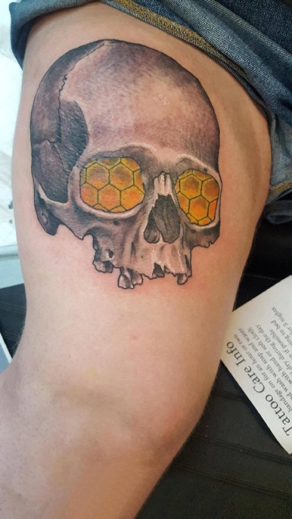 女生大腿上彩绘几何简单线条骷髅纹身图片