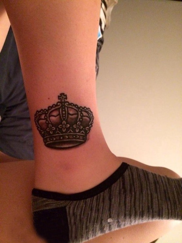 女生小腿上黑灰点刺简单线条花朵和皇冠纹身图片