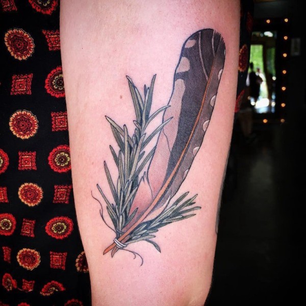 女生手臂上彩绘简单线条植物和羽毛纹身图片