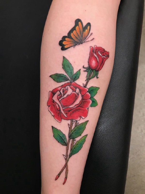 女生手臂上彩绘渐变简单线条蝴蝶和花朵纹身图片