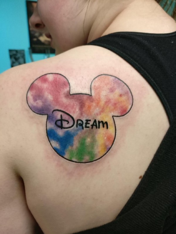 女生后肩上彩绘渐变简单线条卡通米老鼠纹身图片