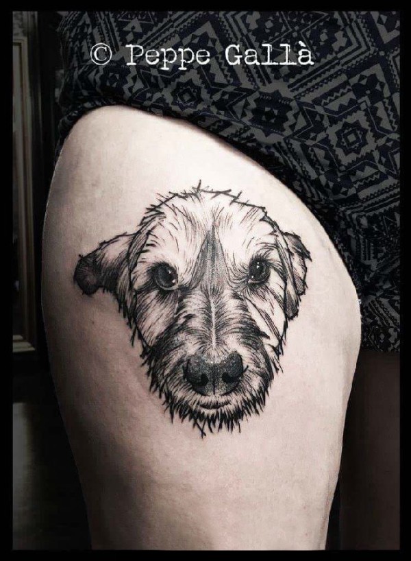 女生大腿上黑色点刺简单线条小动物狗纹身图片