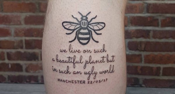 男生小腿上黑色线条素描创意蜜蜂精致花体英文纹身图片