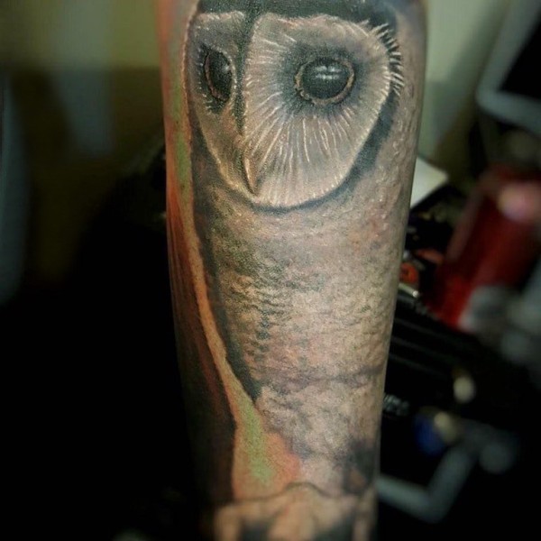 男生小腿上黑灰点刺简单线条小动物猫头鹰纹身图片