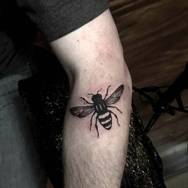 男生手臂上黑灰素描点刺技巧创意蜜蜂纹身图片