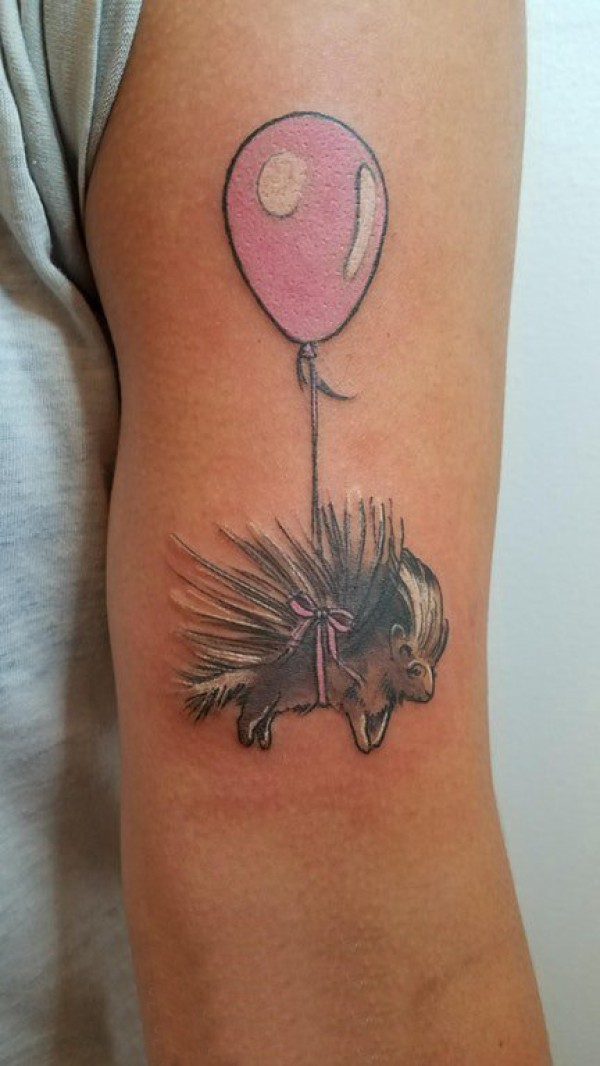 男生手臂上彩绘渐变简单线条气球和刺猬纹身图片