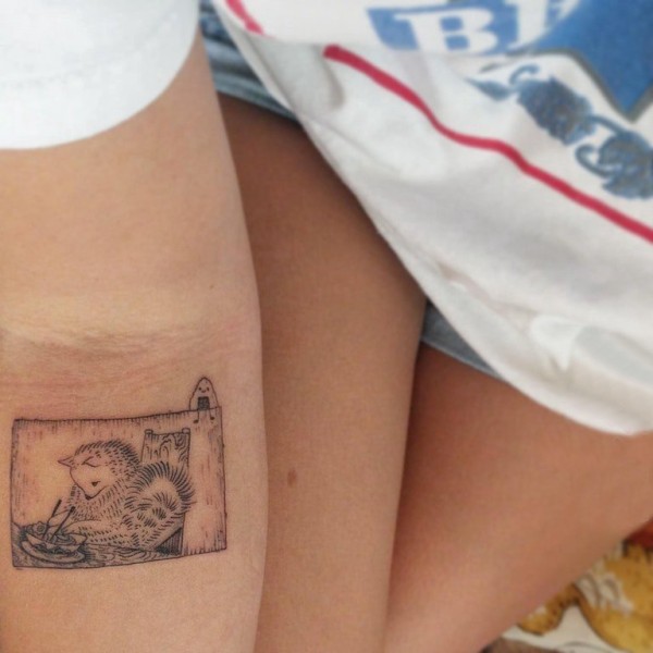 男生手臂上黑灰点刺几何简单线条卡通动物纹身图片