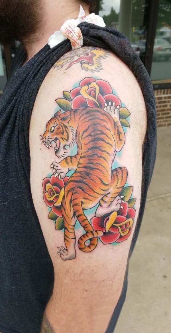 男生手臂上彩绘简单线条植物花朵和小动物老虎纹身图片