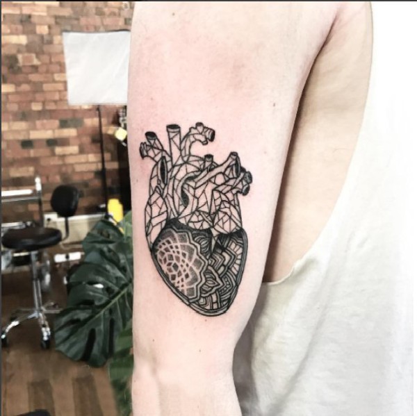 男生手臂上黑色点刺几何简单线条花朵和心脏纹身图片