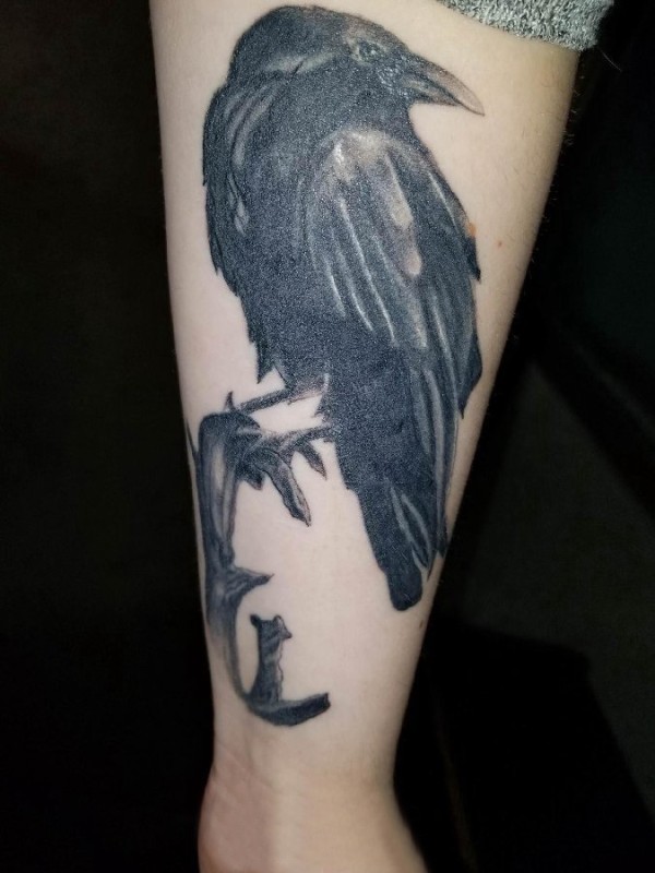 男生手臂上黑色点刺简单线条小动物乌鸦纹身图片