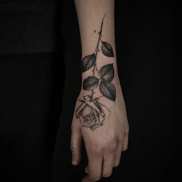 香气扑鼻的黑色点刺简单线条小清新植物玫瑰纹身图案
