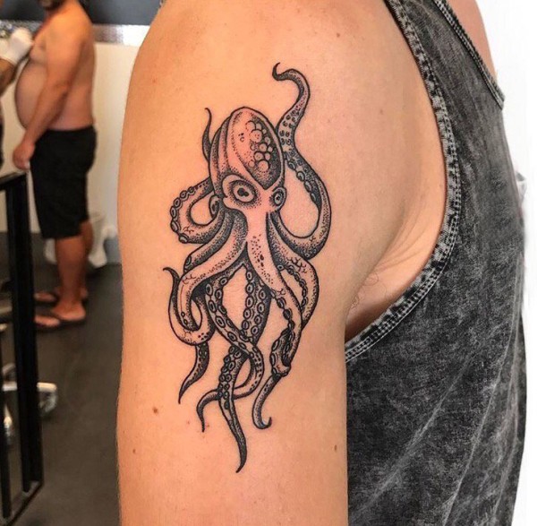 男生手臂上黑灰素描点刺技巧章鱼纹身图片