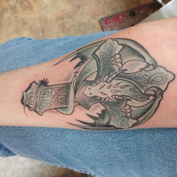 男生手臂上黑灰素描点刺技巧霸气十字架纹身图片