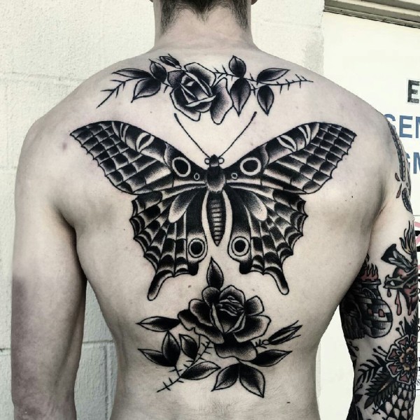 男生背部黑灰素描创意文艺唯美蝴蝶纹身图片