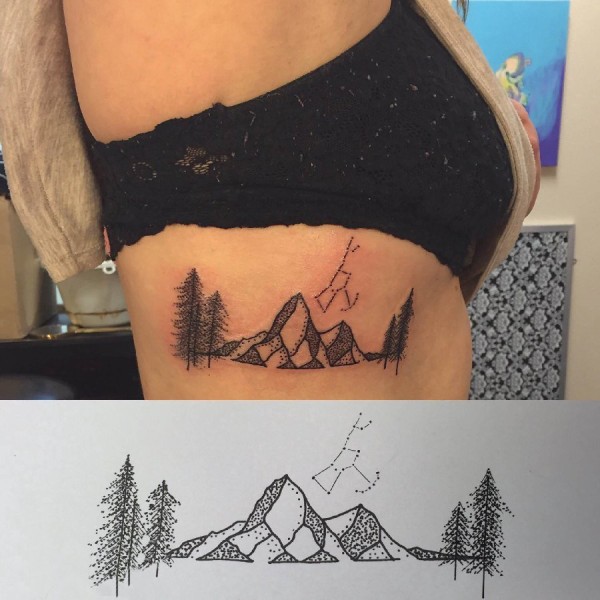 女生侧腰上黑色点刺简单线条大树和山脉纹身图片