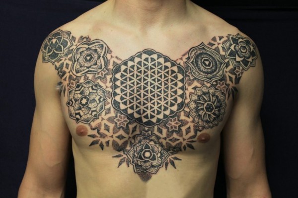 男生胸口上黑灰素描点刺技巧创意梵花花纹纹身图片