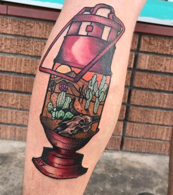 男生小腿上彩绘水彩素描创意煤油灯抽象风景纹身图片