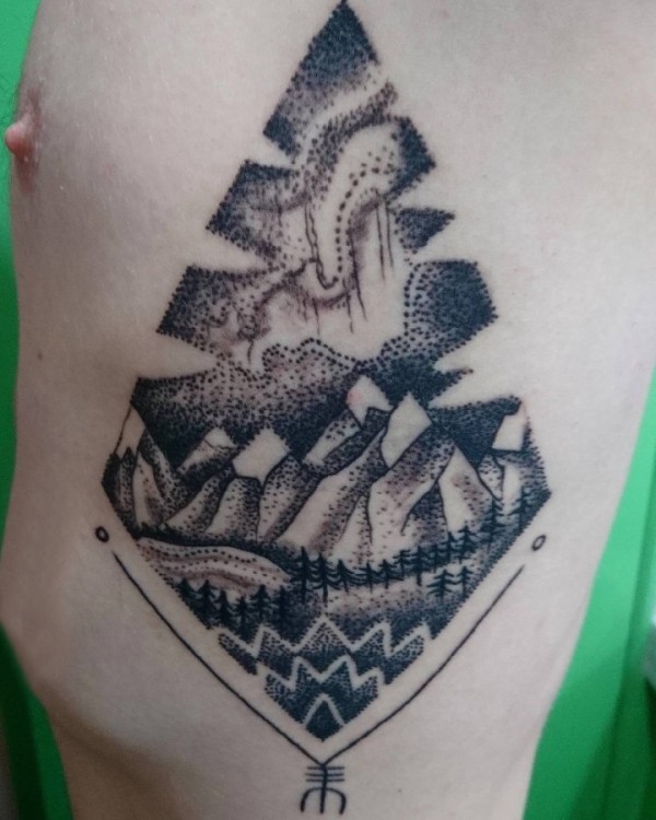 男生手臂上黑灰素描点刺技巧精美文艺风景纹身图片