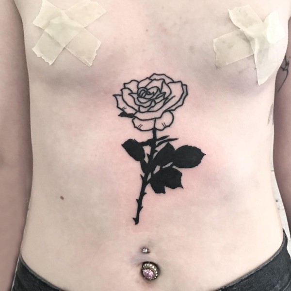 男生腹部黑色简单线条植物文艺玫瑰纹身图片