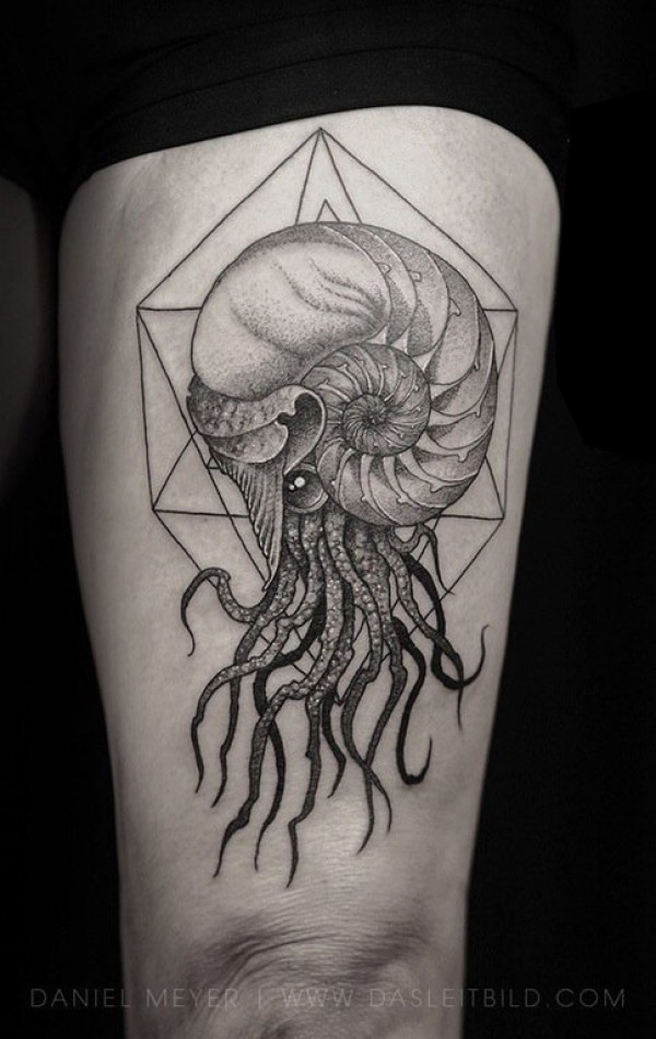 男生大腿上黑灰素描点刺技巧创意章鱼纹身图片