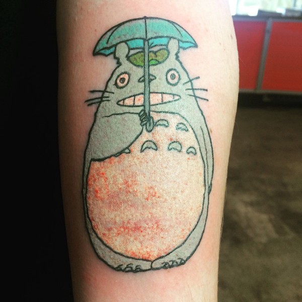 男生手臂上彩绘水彩简单线条卡通龙猫纹身图片