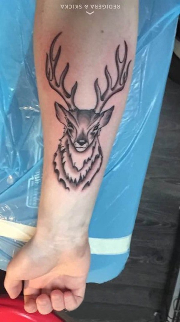 男生手臂上黑灰素描点刺技巧创意麋鹿纹身图片
