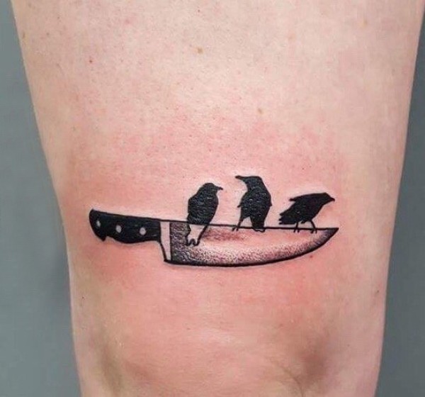 男生手臂上黑灰素描点刺技巧匕首小鸟纹身图片