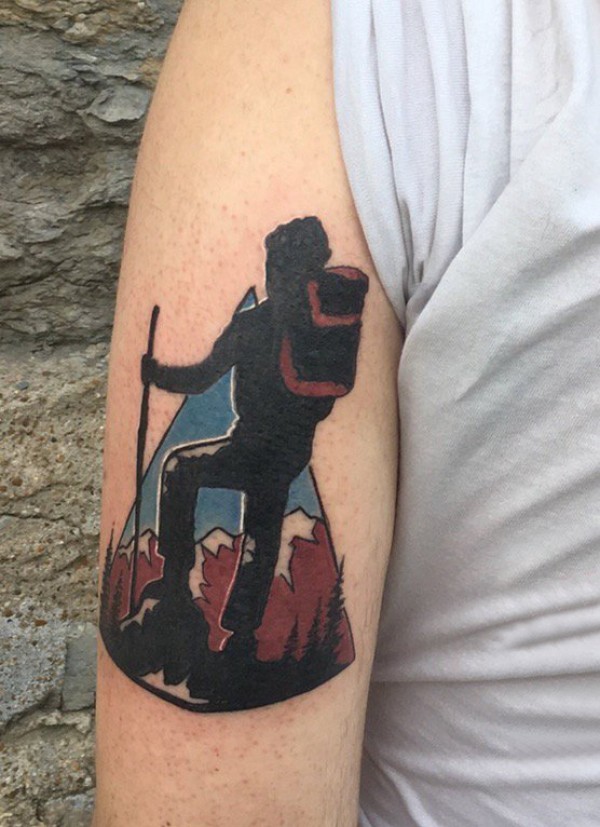 男生手臂上彩绘水彩素描创意登山风景纹身图片