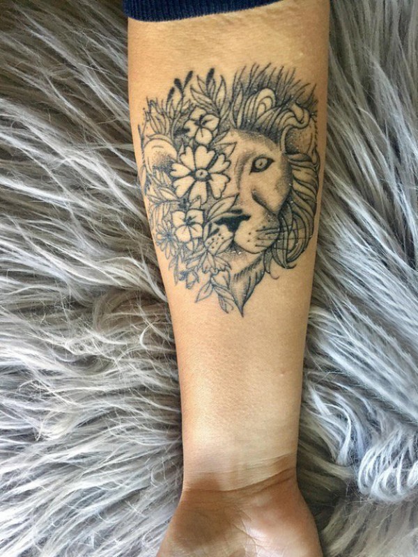 男生手臂上黑灰点刺简单线条植物花朵和狮子拼接纹身图片
