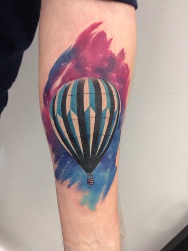 男生手臂上彩绘渐变几何简单线条热气球纹身图片