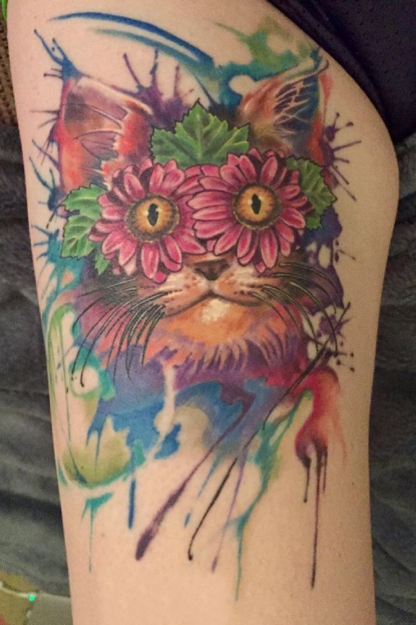 女生大腿上彩绘水彩泼墨可爱狐狸纹身图片