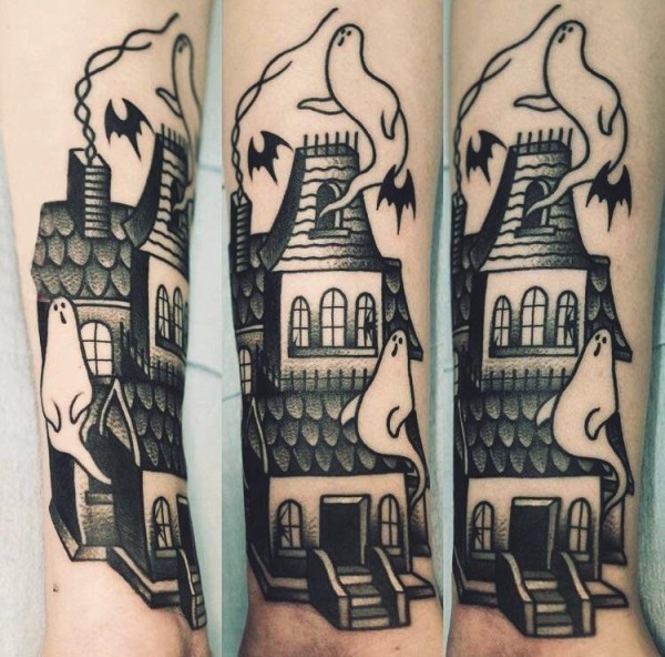 男生小腿上黑色点刺几何简单线条建筑物和幽灵纹身图片