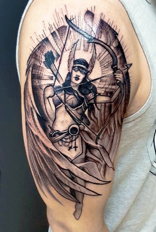 男生手臂上黑灰素描点刺技巧创意肖像翅膀纹身图片