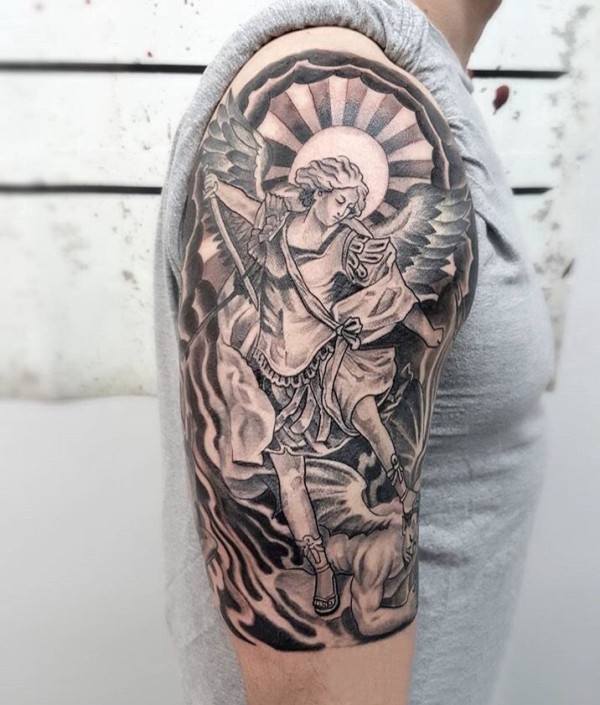 男生手臂上黑灰素描点刺技巧创意天使翅膀纹身图片