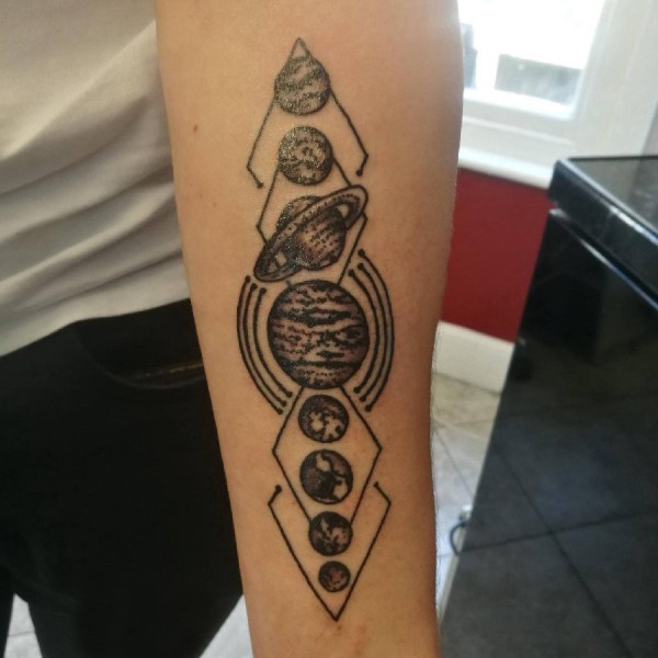男生手臂上黑色点刺技巧几何简单线条星球纹身图片