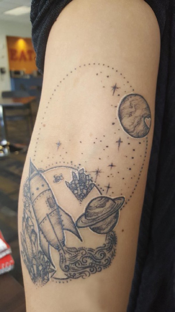 男生手臂上黑灰素描点刺技巧创意文艺宇宙纹身图片