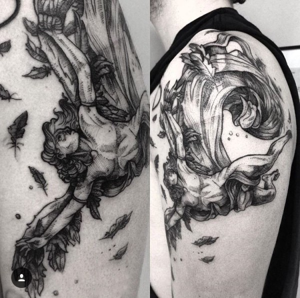 男生手臂上黑灰素描点刺技巧创意古典肖像纹身图片