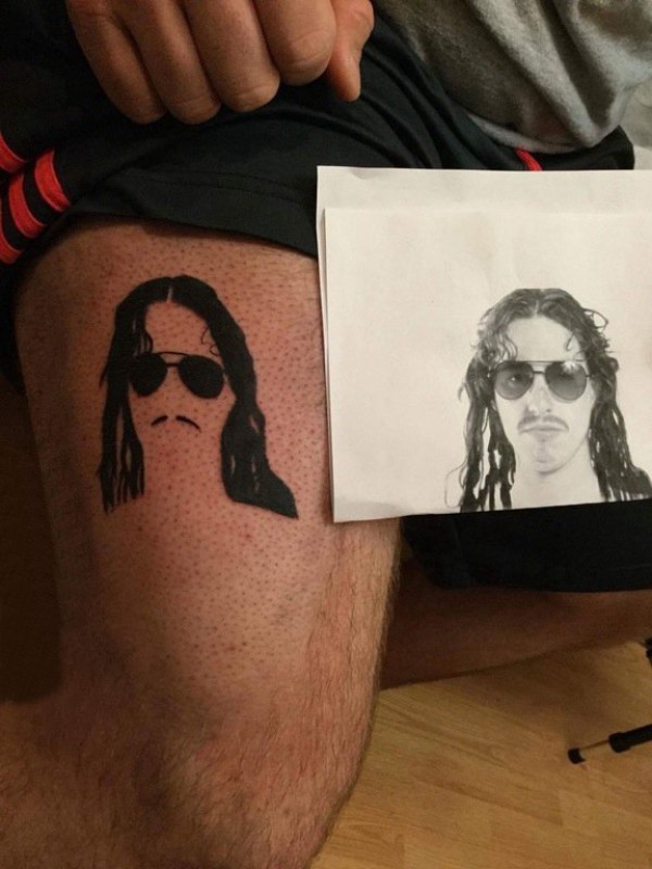 男生大腿上黑灰素描创意精致肖像纹身图片