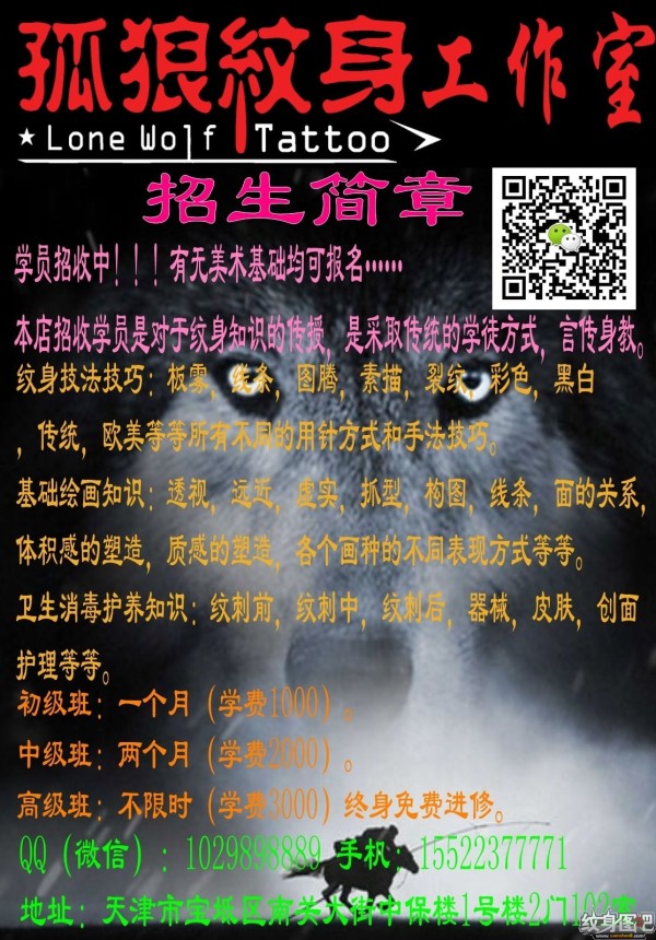 宝坻纹身 孤狼纹身工作室招生简章 宝坻学纹身